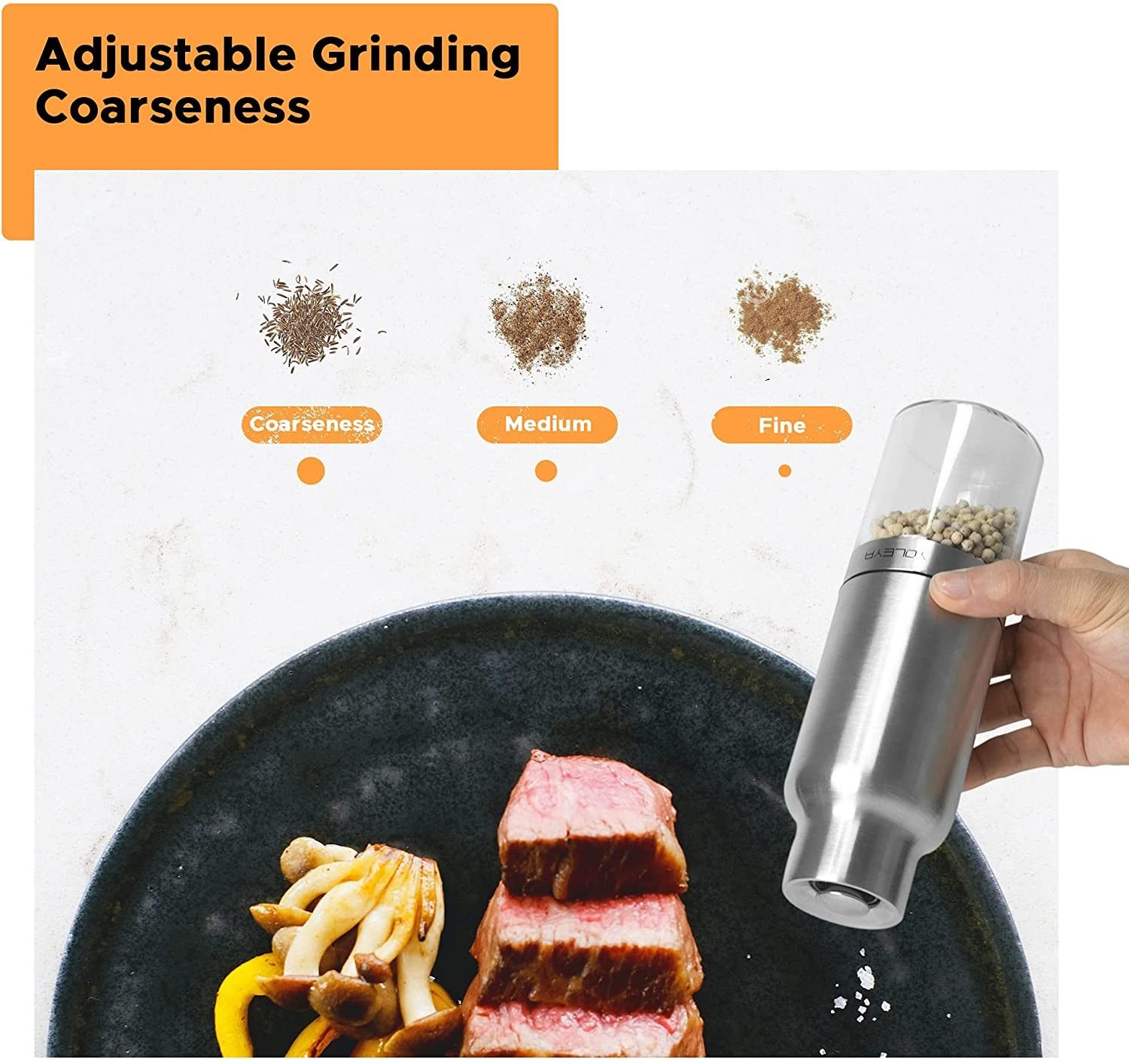 1.Each electric salt and pepper shaker set uses an intuitive one-hand action and gravity to get the grinding done. A top-quality ceramic rotor promises long-lasting use and durability, able to easily grind even the toughest sea salt, Himalayan salt, peppercorns or other dry spice blends.