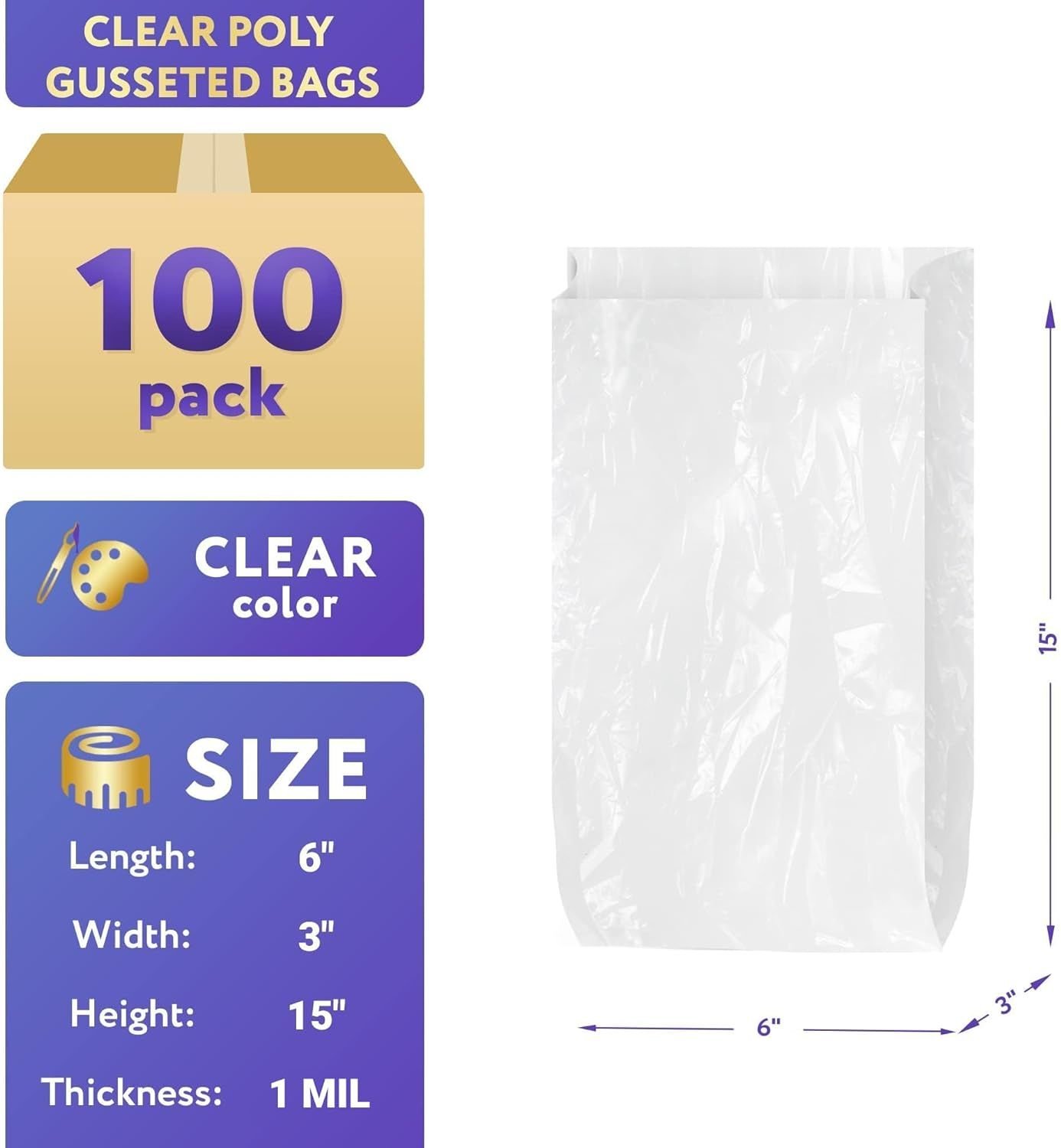 Home > Pack of 100 Clear Gusseted Poly Bags 6 x 3 x 15 Clear Polyethylene Bags 6x3x15 Expandable Side Gusset Bags Thickness 1 Mil for Food Service Industrial