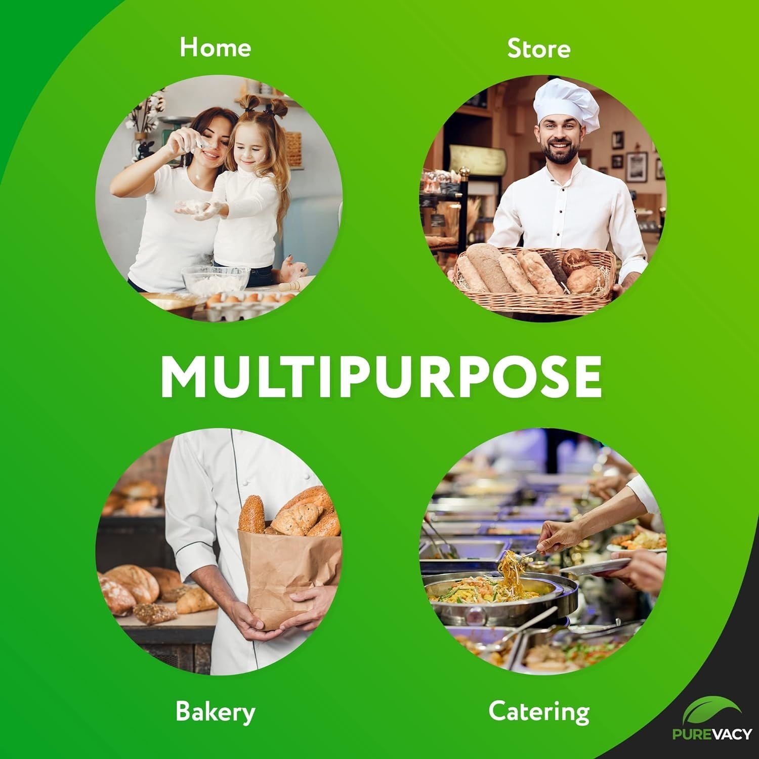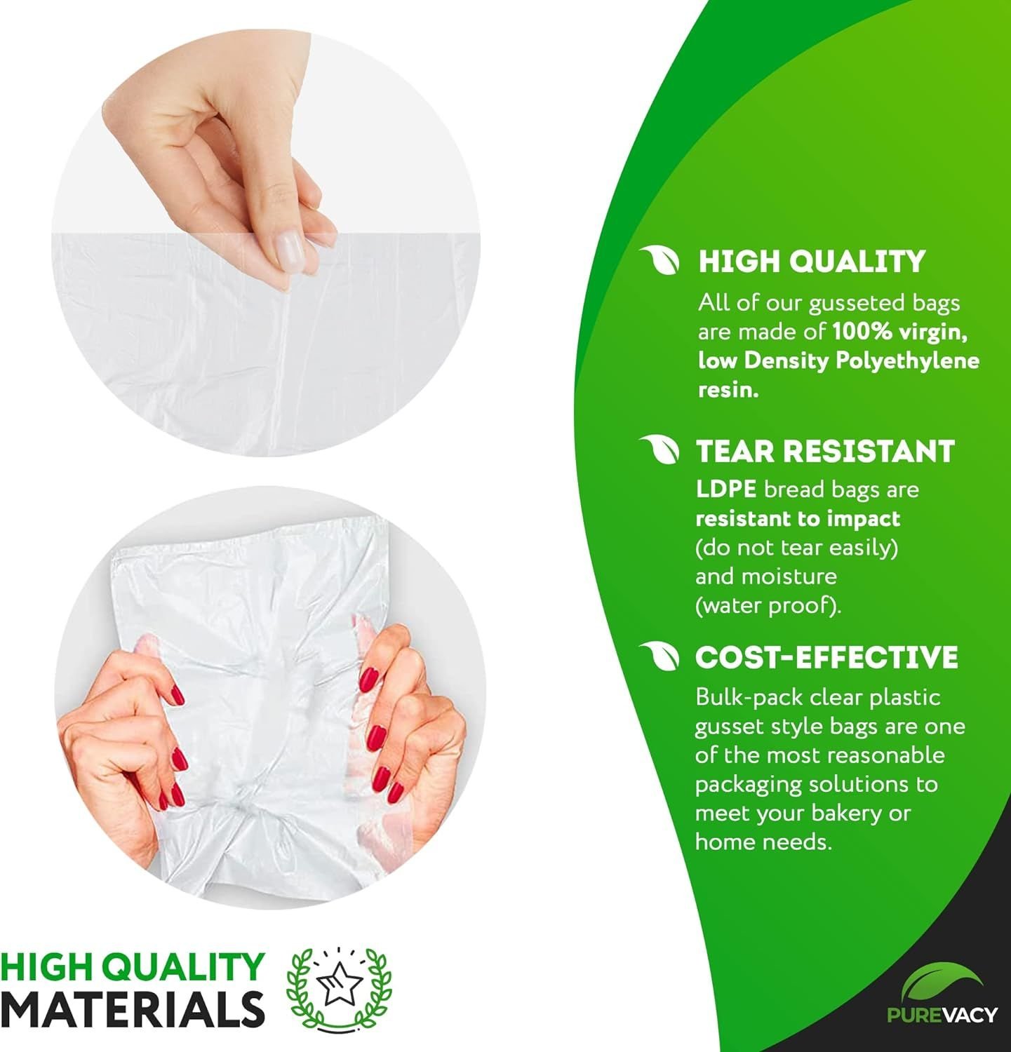 Plastic Bakery Bread Bags 10" x 8" x 24" Quantity: 100 pcs Material: 100% Virgin Low Density Polyethylene Color: Clear Width: 10 inches Side Gusset: 8 inches Height: 24 inches Thickness: 0.75 mil Twist ties are NOT included. Recyclable Storing your food products in these plastic bags helps keep them fresh; so your customers get a better tasting product and your food stays fresh for longer. Each of these grocery bread bag is made of pure Low Density Polyethylene (LDPE) resin that meets all standards for food contact. Additionally; because these clear bakery bags are made out of plastic; they are clear; so your customers can see what they look like without opening the bag. These gusseted bags are a multi-purpose solution for all types of situations from short-term lightweight refrigeration storage and much more. With one open end; these light weight plastic lay flat bags can be sealed by using twist ties; bag tape or by heat sealing. SATISFACTION GUARANTEE: Clear packing bags are backed by 100% guarantee. If you are not completely satisfied with the product; you'll receive your money back!